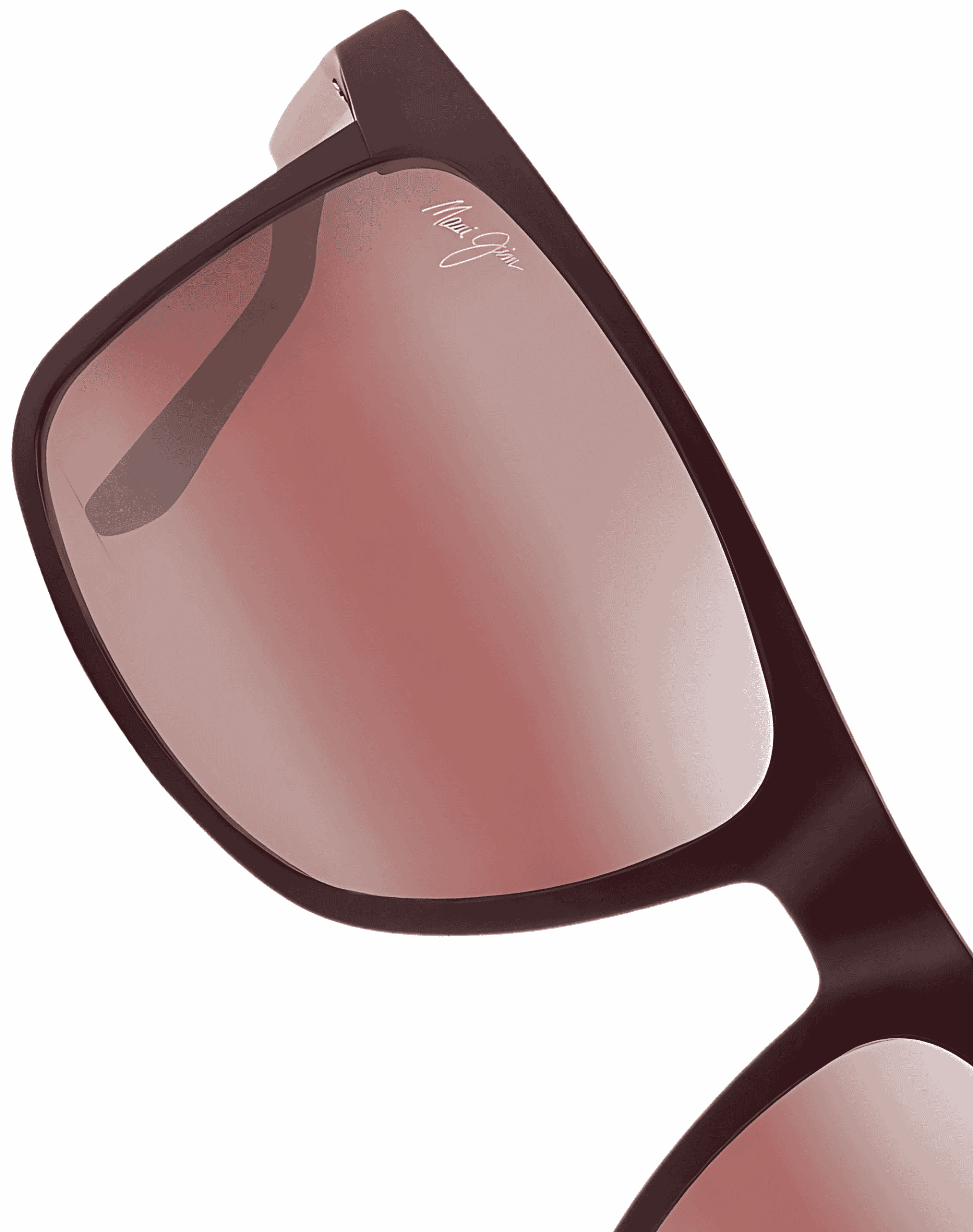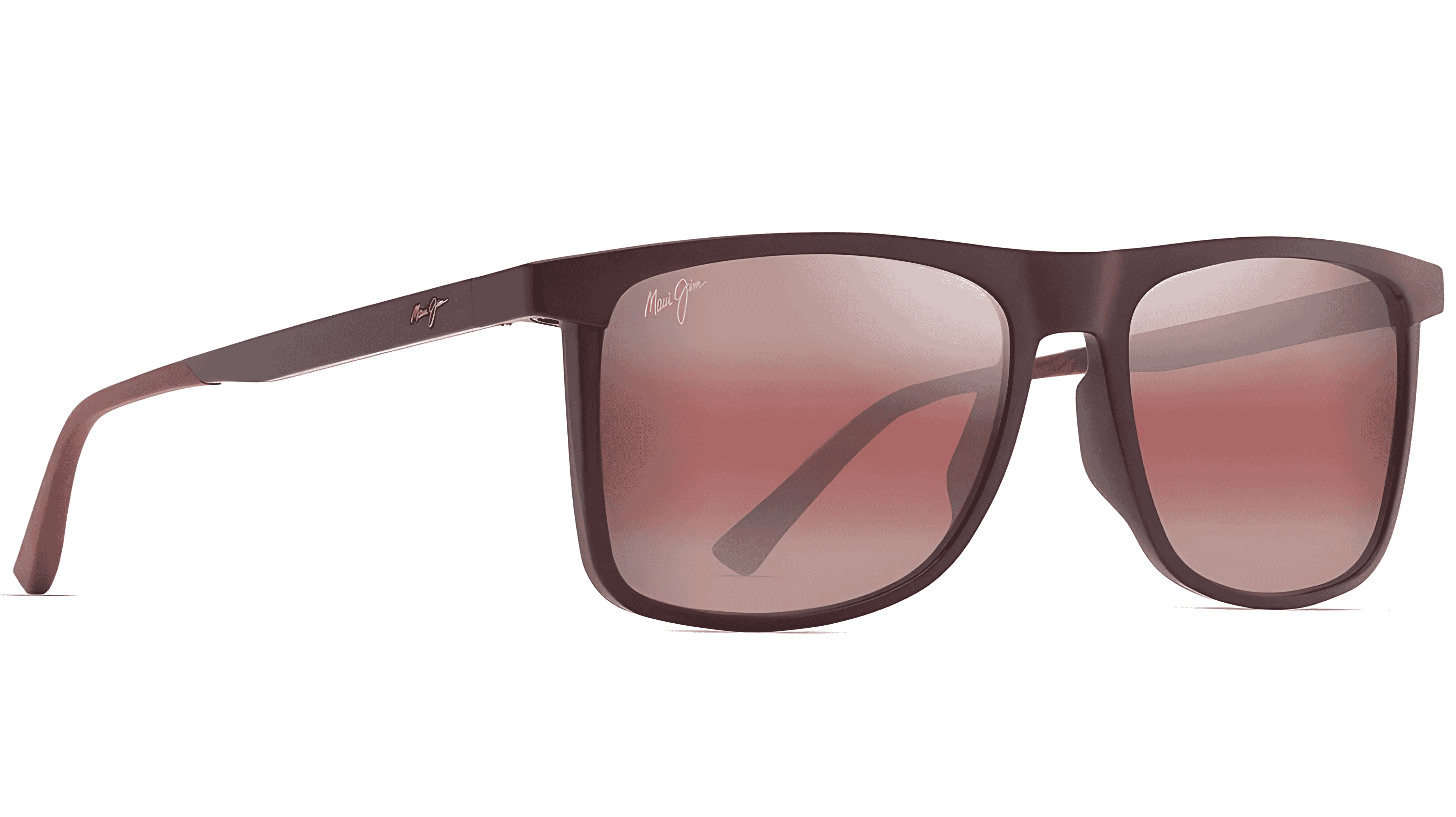 This particular piece are a matte burgundy, full rimmed rectangle sunglasses with polarised maui rose category 3P lenses.